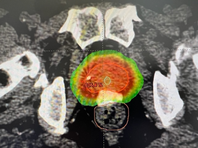 Before radiation therapy can start we must perform a CT-simulation. We construct a vacuum-cushion that will hold you still during treatment, then a CT scan of the pelvis is done. No contrast is required. A few marks are placed on the skin. For the simulation and for the treatment we will advise the patient to consume 2 cups of water 30 minutes prior in order to have a comfortably full bladder. If possible the rectum should be empty-ish from a bowel movement earlier in the day. A simulation appointment takes about 30 minutes. Sometimes an MRI scan of the pelvis will also be performed on the same day as the simulation. Next we design a treatment plan on the computer. This does not require any participation from you! It takes 2 – 7 days to create and QA test a computer plan, then we are ready to start treatment on you.